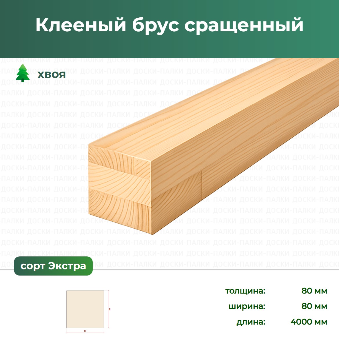 Клееный брус сращенный Хвоя, 80×80×4000 мм, сорт Экстра — клееный брус из хвои. Стандартное качество для капитального строительства. Прочнее цельного массива на 50–70%. Стабильные размеры. Подберём сечение — закажите в магазине Доски-Палки.