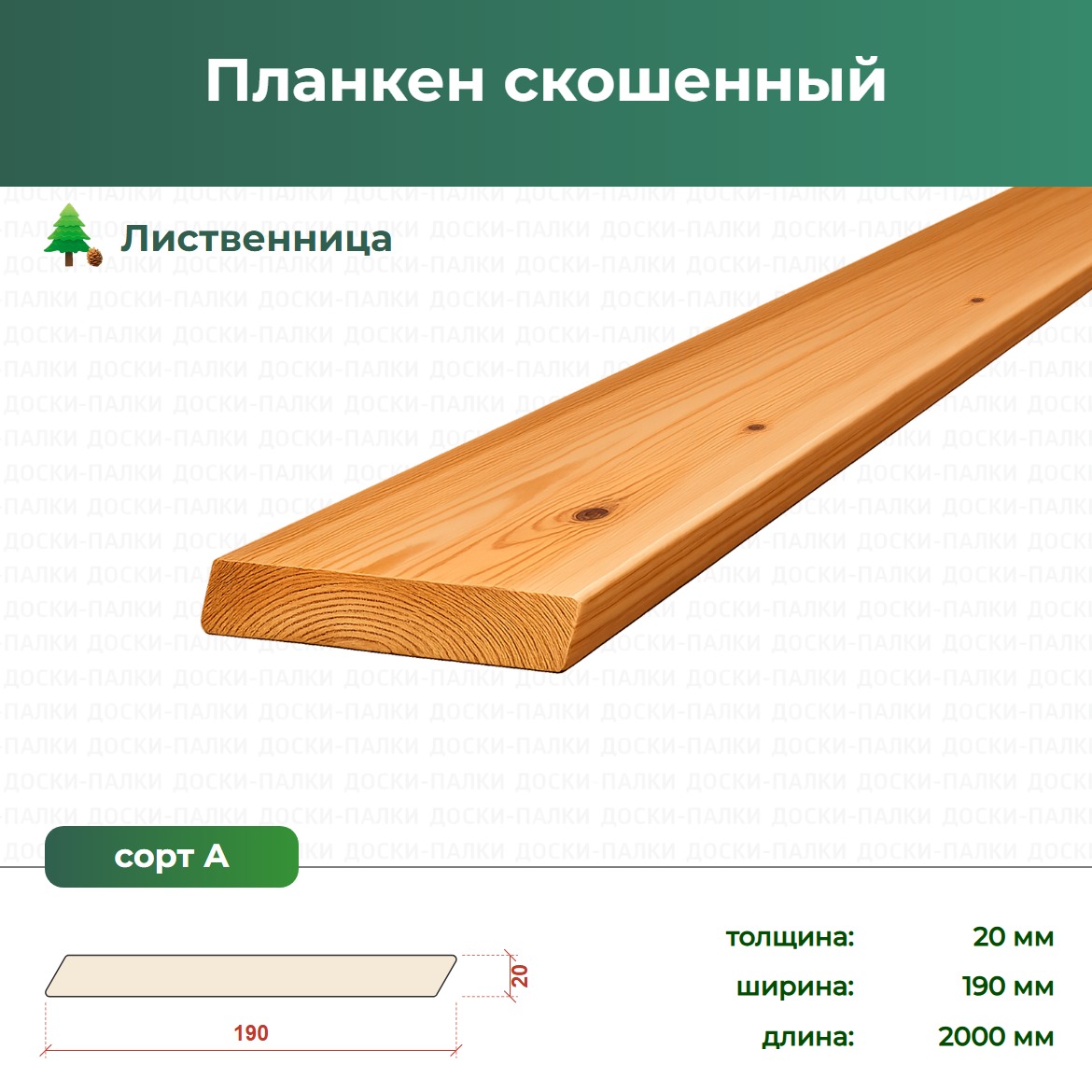 Планкен скошенный Лиственница, 20×190×2000 мм, сорт А — фасадная доска из лиственницы с гладкими кромками. Сорт А. Монтируется с зазором — стены дышат, фасад служит дольше. Устойчив к осадкам и перепадам температур. Современный лаконичный вид. Поможем подобрать крепёж. Доставка по Москве и МО — интернет-магазин Доски-Палки.