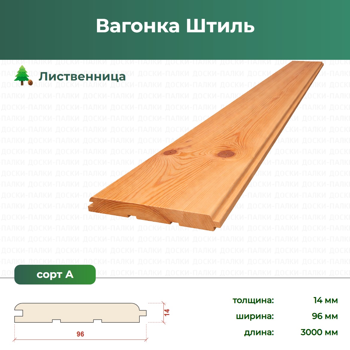 Вагонка Штиль Лиственница, 14×96×3000 мм, сорт А — облицовочная доска из лиственницы камерной сушки. Теплопроводность хвойных пород в 5–7 раз ниже кирпича — дополнительная теплоизоляция помещения. Простой монтаж на кляймеры или саморезы. Поможем подобрать крепёж и сопутствующие материалы. Доставка по Москве и МО от Доски-Палки.
