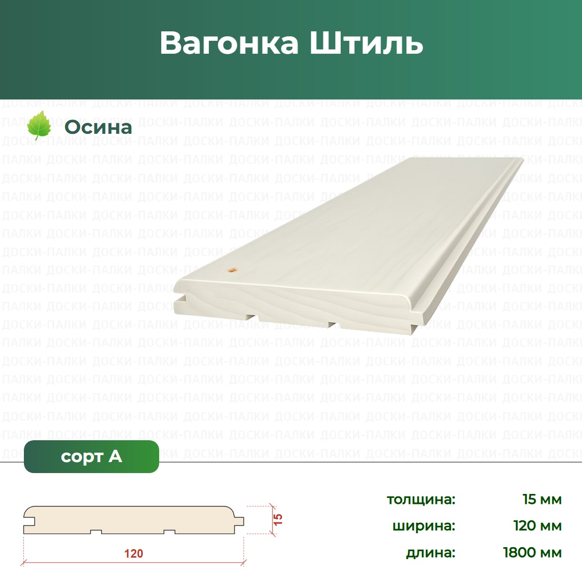 Вагонка Штиль Осина ТУ, 15×120×1800 мм, сорт А — вагонка из осины для отделки стен и потолков. Сорт А — здоровые сучки, ровная геометрия, отличное соотношение цены и качества. Подходит для большинства отделочных задач. Камерная сушка. Рассчитаем объём под ваш проект. Доски-Палки — умно подберём, быстро привезём!